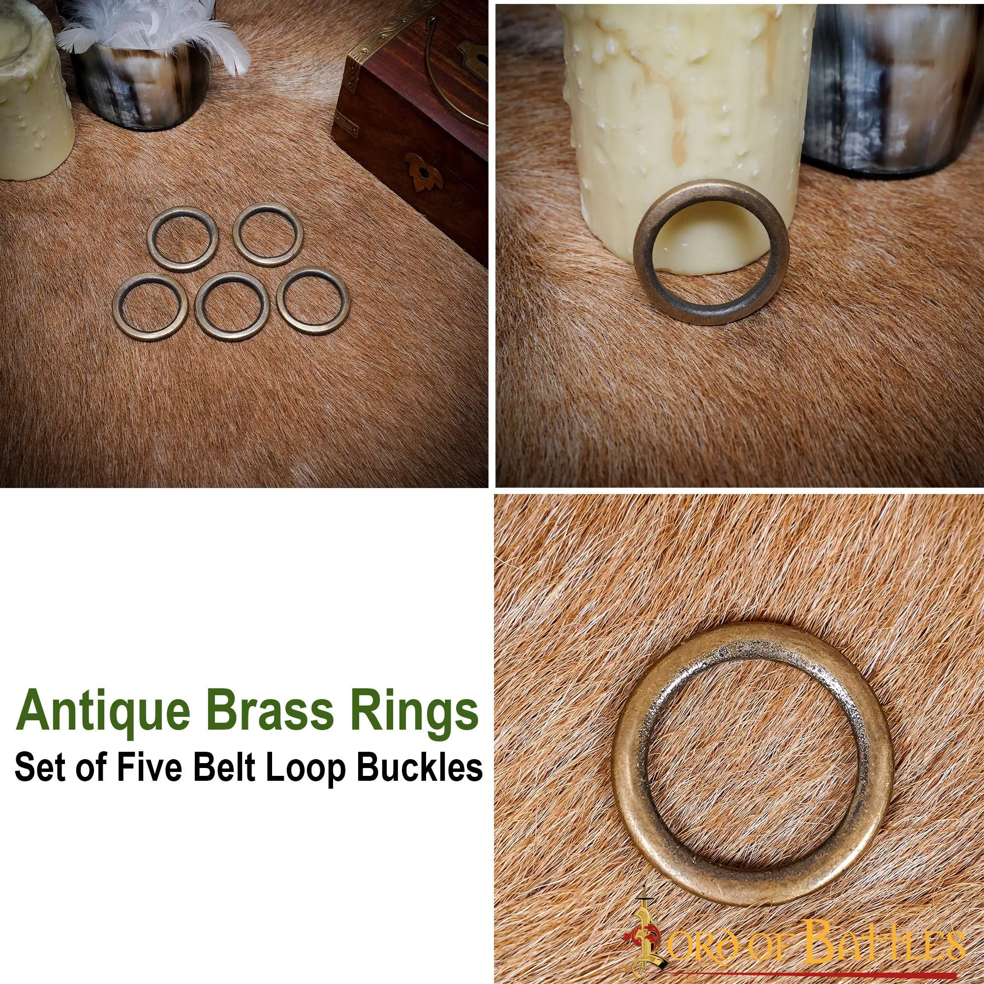 It is well designed from solid ANTIQUE BRASS, which gives it a rustic appeal to enhance a wide range of costumes or outfits. It comes in a set of 5 pieces, each with an inner diameter of approx. 2.9 cm. These measurements allow it to fit a 2.8-2.9 cm wide belt strap.