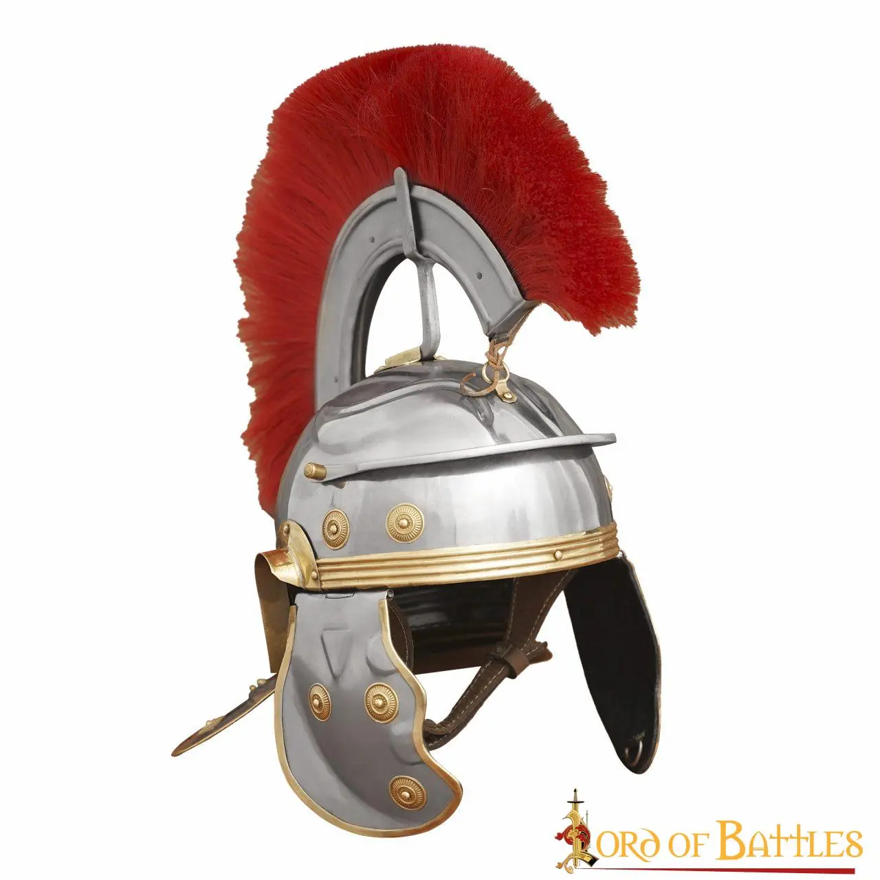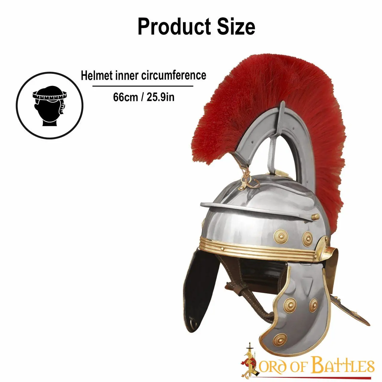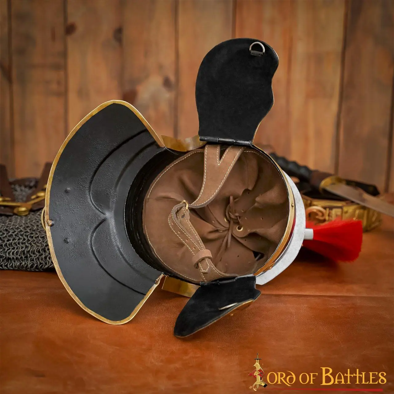This gorgeous helmet is HANDMADE from 18-gauge mild steel, lined with a comfortable and secure faux leather liner. A circumference of approximately 68 cm makes it fit almost all head sizes. The historic crest attached to the top will make your Roman outfit stand out! Note: This product is carefully coated with a layer of oil when packaged that acts as a temporary (protective) layer against corrosion (rust), which can easily be wiped off using any oil remover or even a dry cloth.