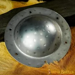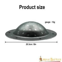 It is painstakingly handcrafted from sturdy 12 gauge MILD STEEL and makes a functional shield boss. Its natural texture adds to the raw medieval look. Its diameter is approx. 20.3 cm.