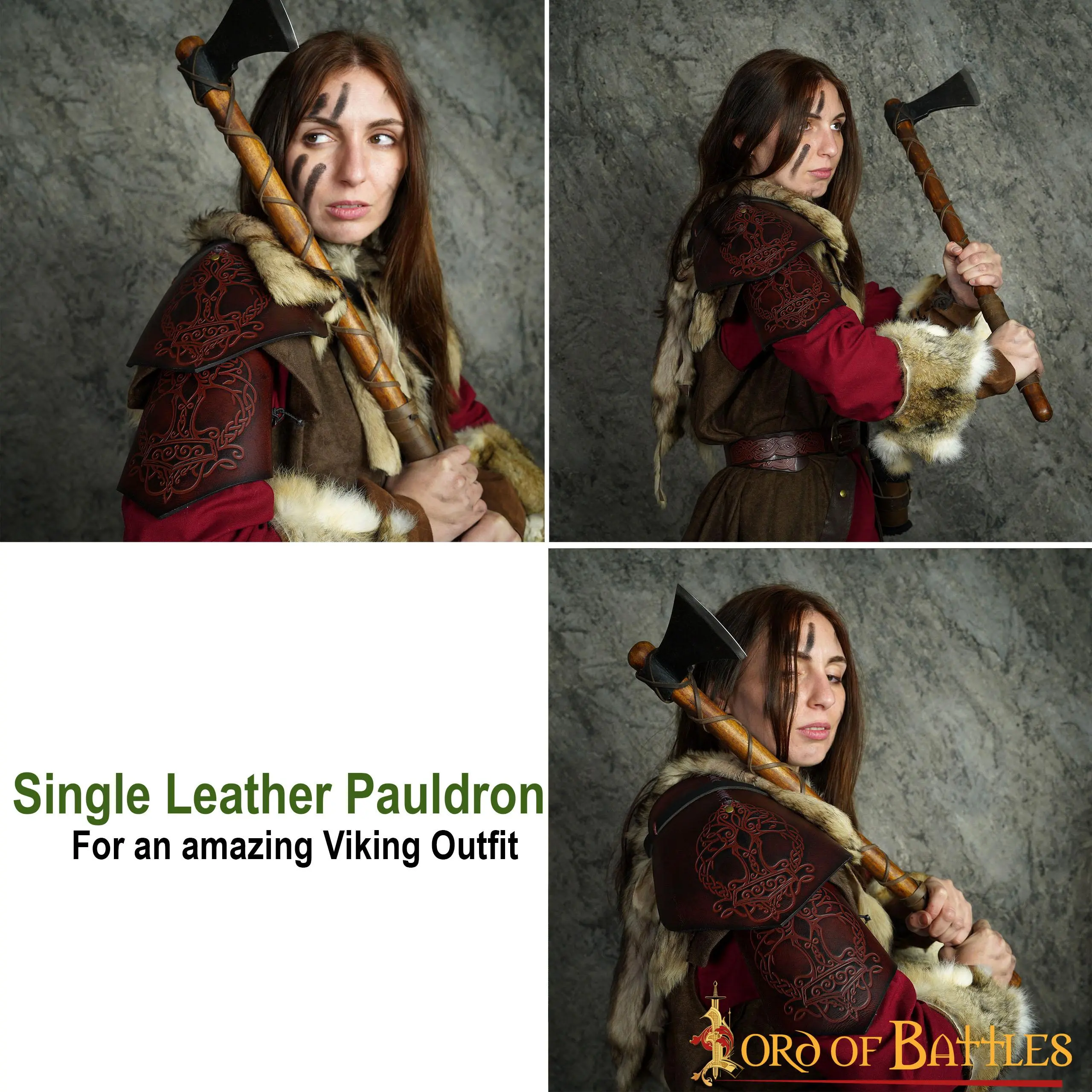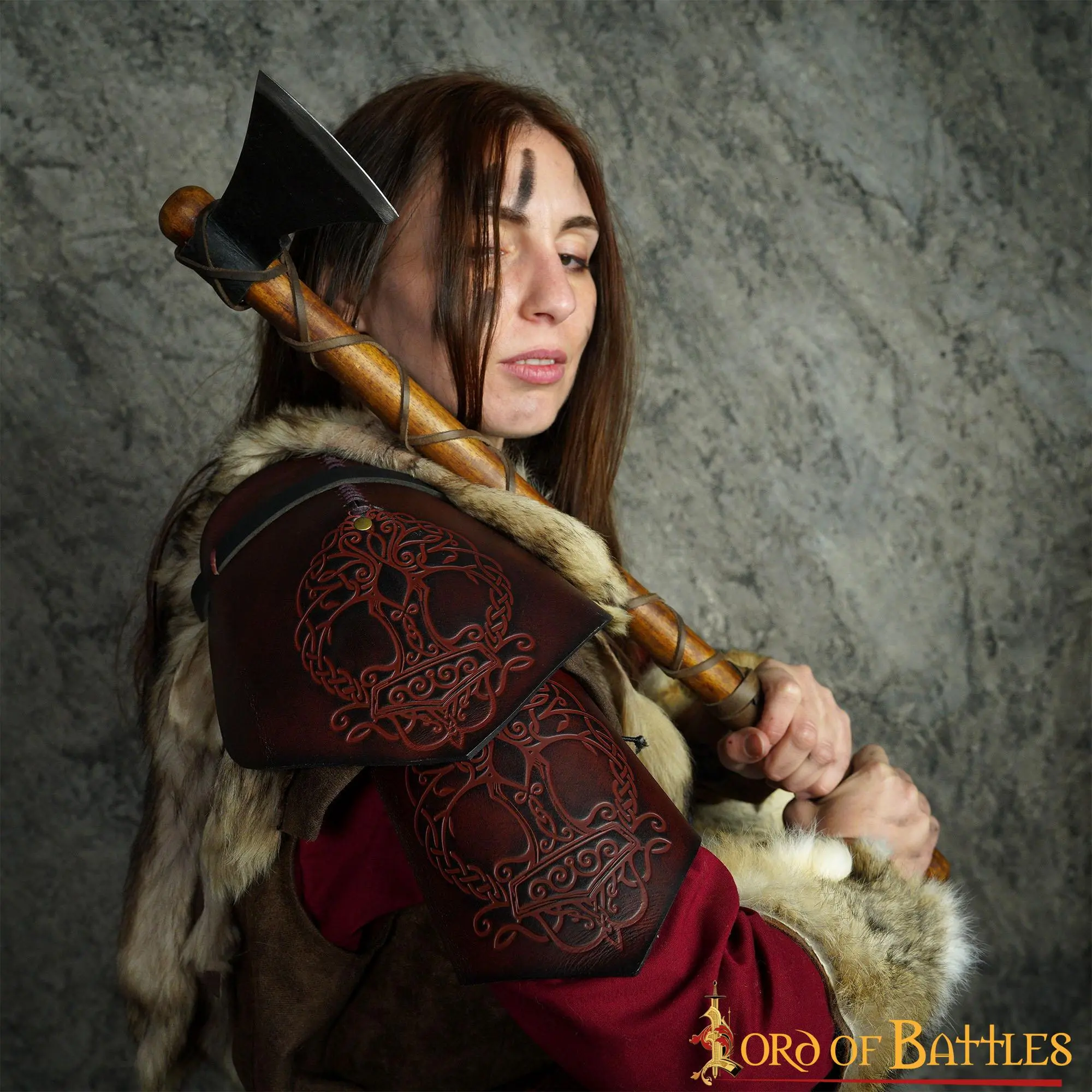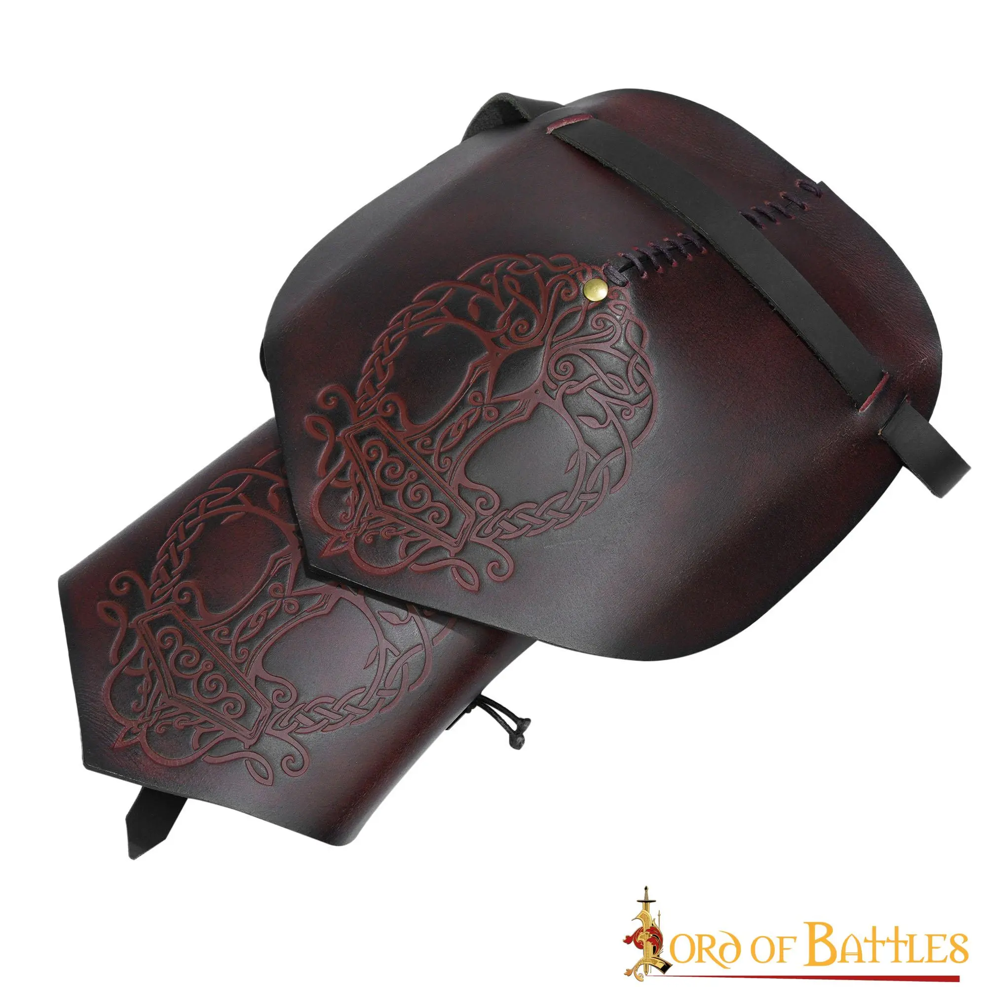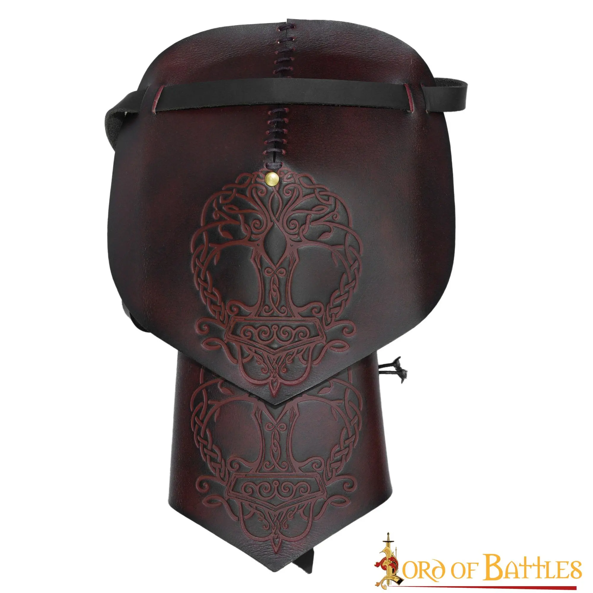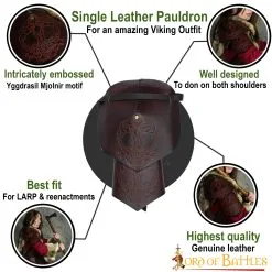 Looking for the best accessory that could make your ordinary Viking costume a truly outstanding one? This leather pauldron, richly embossed with historical Yggdrasil Mjolnir design, will surely befit this character. This pauldron is provided as a single-shoulder costume piece.