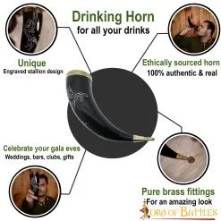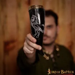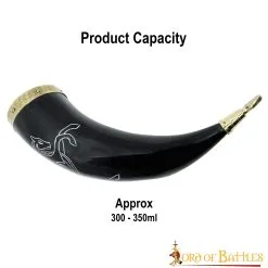This drinking horn is handmade from a real, genuine Ox horn. The total capacity of the horn is approx. 300-350 ml (of a liquid with up to 20% alcohol content). Please avoid dishwashers and hot beverages. Before use, make sure to wash under running water. For a longer life, treat with bees’ wax after each use. Please note this is a natural product that decays with time and, hence cracks may come.