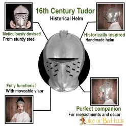 The Tudor close helmet is the natural evolution of the classic late medieval armet. Its profile and shapes have changed just like the way it closed around the head of the wearer, but the general idea remains the same: protecting the knight as well and as conveniently as possible. During the 16th century, it was used both at war and at magnificent jousting events typical of the Tudor court. IT IS PERFECT AS A DÉCOR PIECE, MEDIEVAL FAIR OR EVENT, BUT NOT AS A FUNCTIONAL FORM OF ARMOUR.