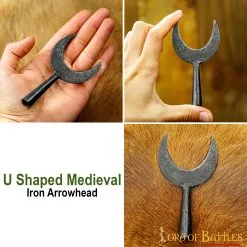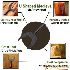 This U-shaped arrowhead is well-designed and crafted for various purposes on the battlefield or in warfare! One of the most realistic uses known of this arrowhead is in cutting sails in naval warfare to slow your opponent’s ships down! It can, however, be greatly useful in shooting small animals such as rabbits or birds as its U-shape prevents it from getting under the grass. One of the most realistic uses stated, is it being used for cutting ropes of trebuchet and catapults, but unless you are Robin Hood, it’s not working! Note: This product is carefully coated with a layer of oil when packaged that acts as a temporary (protective) layer against corrosion (rust), which can easily be wiped off using any oil remover or even a dry cloth.