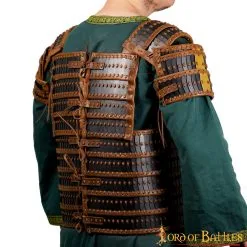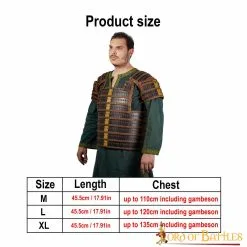 The 20 gauge plates are bound with thick leather backing and fitted to a robust, genuine leather frame for the armour. While donned, it is tied and secured in the back with leather cords and matching leather tabs. It is available in three sizes: medium (chest up to 110cm), large (chest up to 120cm) and extra-large (chest up to 135cm) (Measure yourself WITH gambeson) and is highly adjustable thanks to its multiple genuine leather straps.
