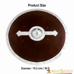Handcrafted from GENUINE WOOD, this shield has a diameter of approx. 30 inches making it a functional piece of Viking art. For a firm grip, this shield has an adjustable leather strap and a metal handle reinforced with wood. The conical umbo and fittings on this shield are made from MILD STEEL. This shield is FULLY-FUNCTIONAL and a perfect fit for reenactments as well as décor.
