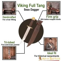 This is a FULL TANG seax, HAND FORGED from TOUGH CARBON STEEL. The tri-lobed PURE BRASS pommel and leather-wrapped handle support an amazing grip of the weapon. Its total length is approx. 45.7 cm. To keep it safe and protected for years to come, it is provided with a genuine leather sheath.