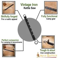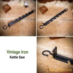 Make the best out of your next camping experience with our vintage iron kettle saw/cauldron hook! It is well-designed with precise technical details that make it great for practical usage, holding your cauldrons or pots firmly while you cook a scrumptious meal by the river!