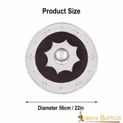 This shield, of approx. 22 inches in diameter, is meticulously handmade from STURDY GENUINE WOOD. This shield comes with a leather strap and a metal handle, reinforced with a wooden cover for a better grip. The metal details of this shield are made of 18 gauge mild steel, while the umbo is made of 16 gauge mild steel.